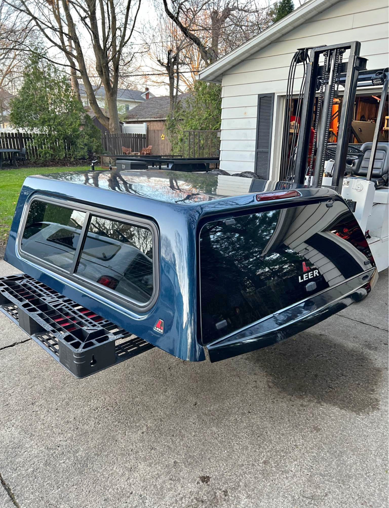 Paint code is “N1” called “Blue Jean Effect”. Frameless rear door, solid front window. Side windows have slider. Has a carpeted interior liner. Has a couple chips around the edge like the last photo, a couple more spots with blemishes but can be touched up easily. Comes with clamps and key